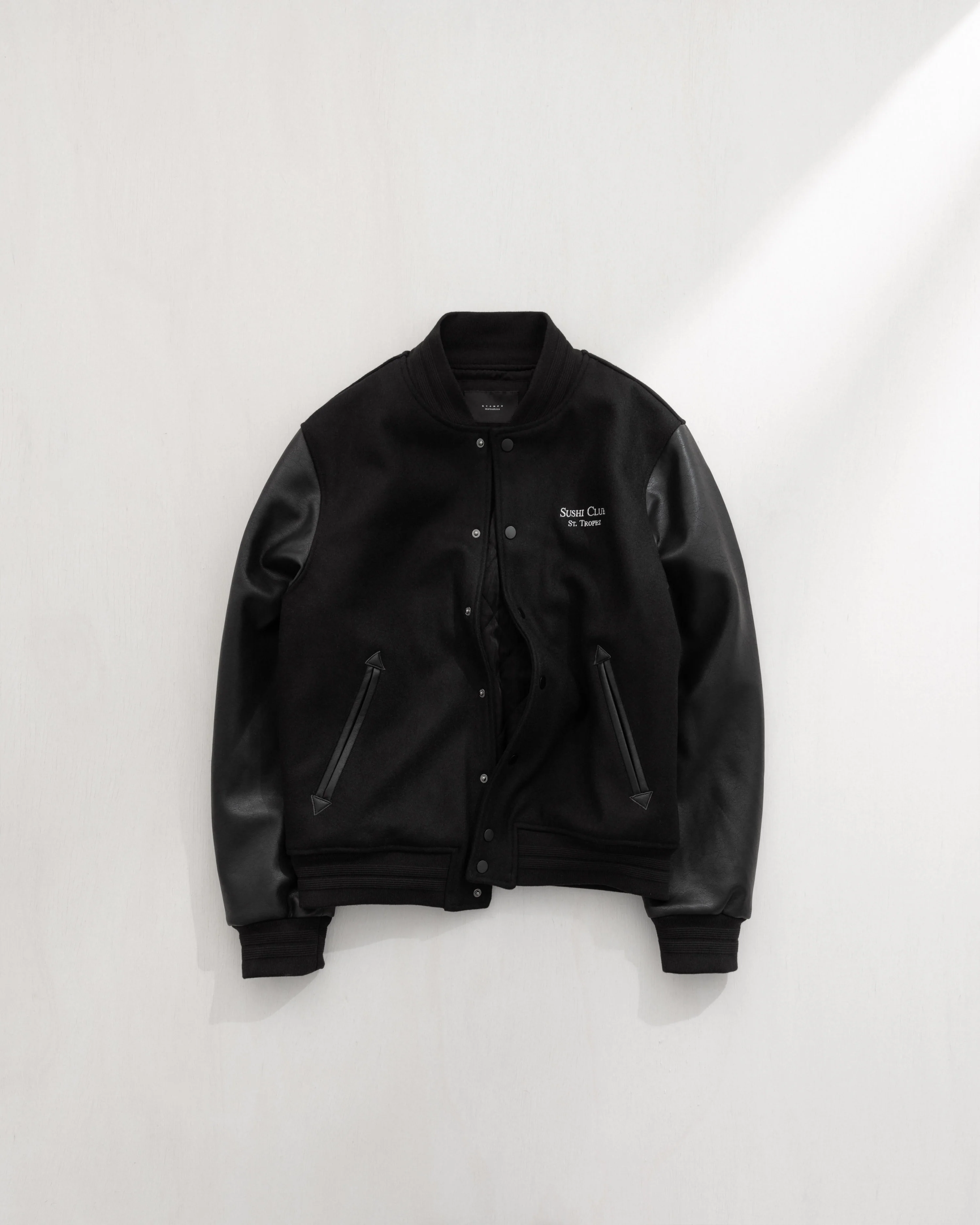St. Tropez Sushi Club embroideries at front left chest and center back.